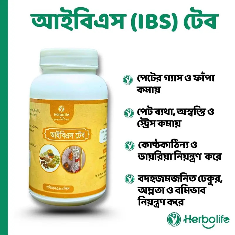 IBS Tablet একটি সম্পূর্ণ প্রাকৃতিক ভেষজ ফর্মুলা যা Irritable Bowel Syndrome (IBS) বা অস্বাভাবিক অন্ত্রের সমস্যার উপশমে কার্যকর। ❇️এটি হজমে সহায়তা করে, পেটের ব্যথা, গ্যাস, কোষ্ঠকাঠিন্য বা ডায়রিয়ার মতো উপসর্গগুলো নিয়ন্ত্রণে আনে।